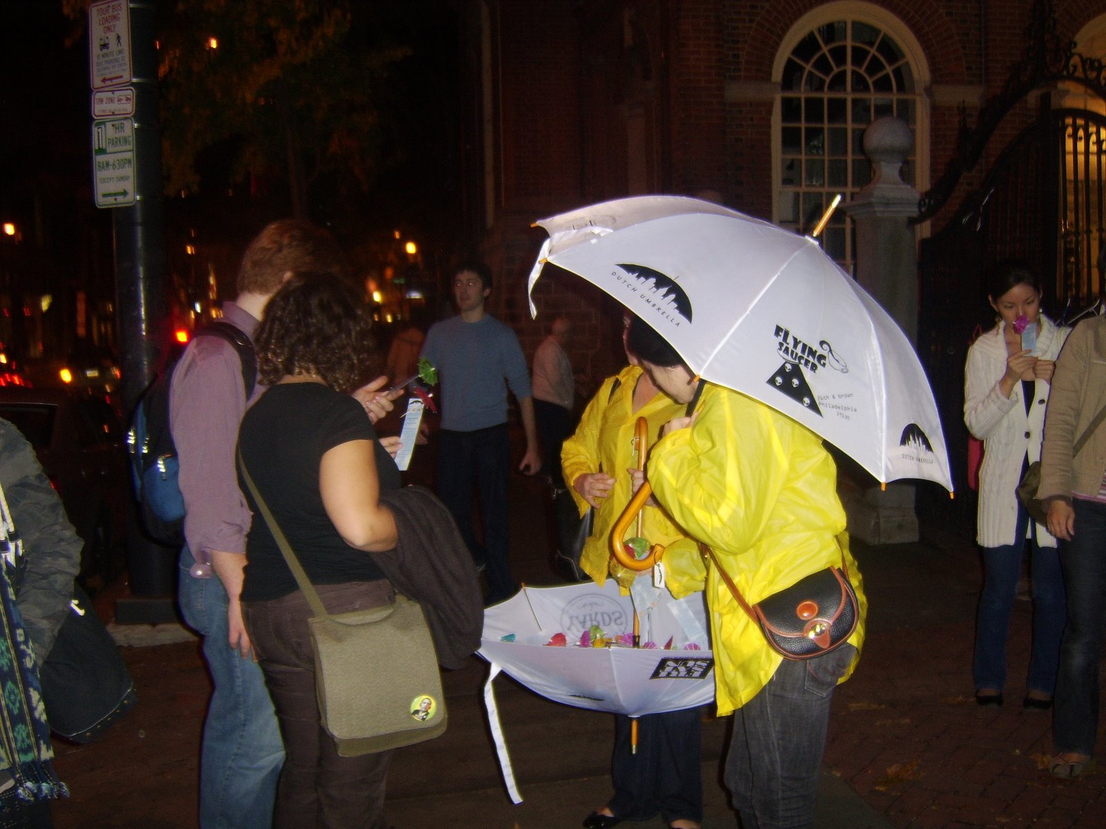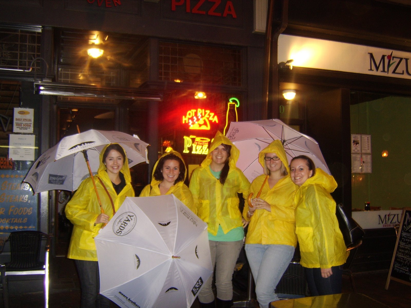 Last night, members of PRowl Public Relations participated in a night of active outreach for our client, Dutch Umbrella. We dressed in rain-gear and handed out bookmarks with cocktail umbrellas attached to the people who attended First Friday in Old City.