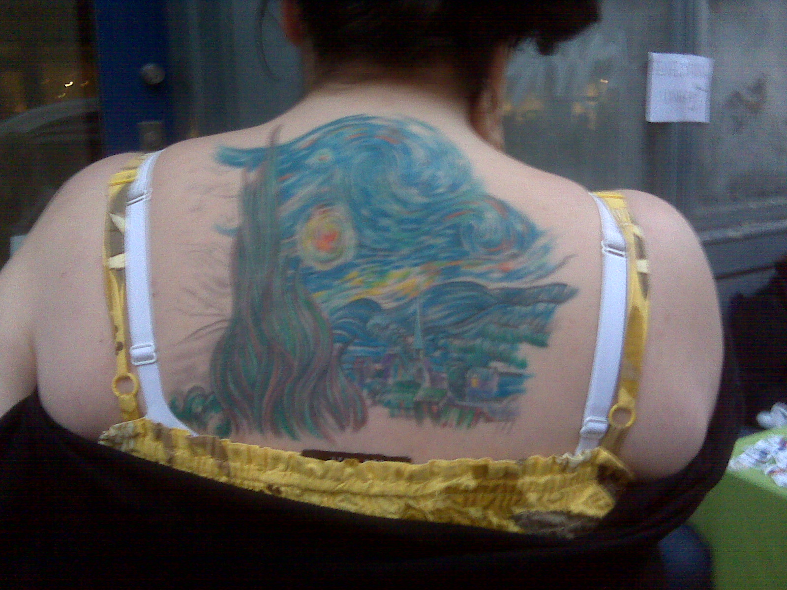 Girl on the street with Van Gogh’s “Starry Night” on her back!