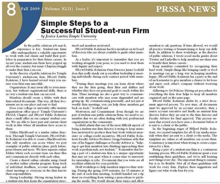 In the fall 2009 issue of “Forum,” the publication of the national Public Relations Student Society of America, our own Temple University PRSSA President, Jessica Lawlor, has her article featured about “Simple Steps to a Successful Student-Run Firm.” Written when Jessica was Director of PR for PRowl Public Relations, she is more than qualified to discuss things that make PRowl Public Relations successful, as well as challenges that we face. I’m even quoted in it, so check it out!