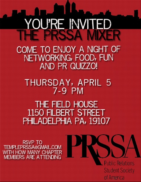 Be sure to join us on April 5 where Temple PRSSA will be providing free food, a complimentary drink ticket, and an entertaining game of PR Quizzo! We hope to see you there!