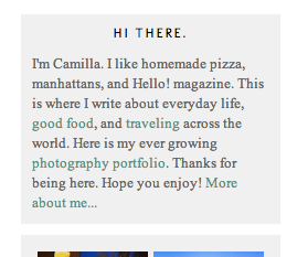 4. State Your Purpose: The purpose of your blog should be clear as soon as bloggers hit the first page. Include a little blurb that explains who you are (example on the right from http://www.camillaleila.com/), and what you blog about. If your blog is about something that interests the reader, they are more likely to stay and click around.