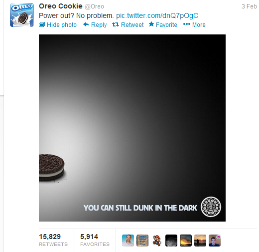 Twitter was overwhelmed with followers asking questions about the ill-timed power outage at Super Bowl XLVII on Sunday. While PR pro’s were playing crisis management what-if’s, Oreo stole the spotlight with their, “Power out? No problem,” tweet.