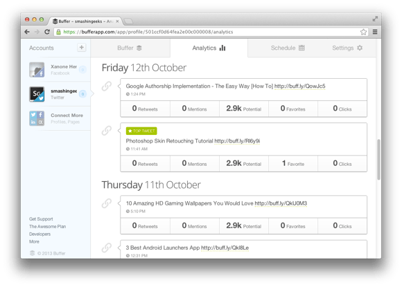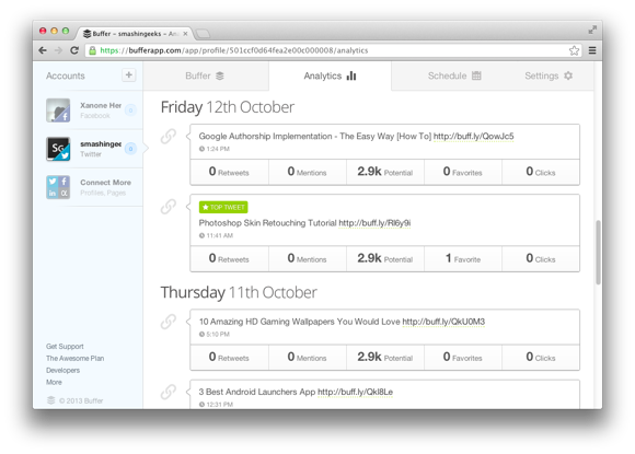 With the basic FREE buffer account, inside the dashboard you can create a schedule with set times that you would like your content to be posted. As you “buffer” your posts, each post will be filled into a pre-defined time slot! This allows you to spread your posts out throughout the day, without all of the hassle. This tool is great for anyone promoting the same piece of content, such as an event or upcoming deadline, throughout the day. You can also plan to buffer posts for the week, and easily move things around via the web or your smart phone if there are any changes in your schedule.