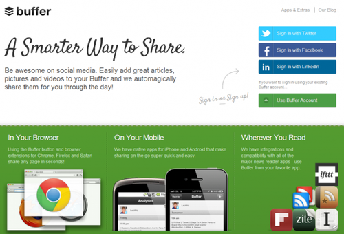 Buffer creates a smarter way to share and schedule your social media posts. It allows you to use a traditional scheduling method, where you select a time and date for your post to go live, or you can chose to “buffer” your post. Basically, Buffer will handle the hard part and helps you to create a strategic sharing schedule that suits your needs.