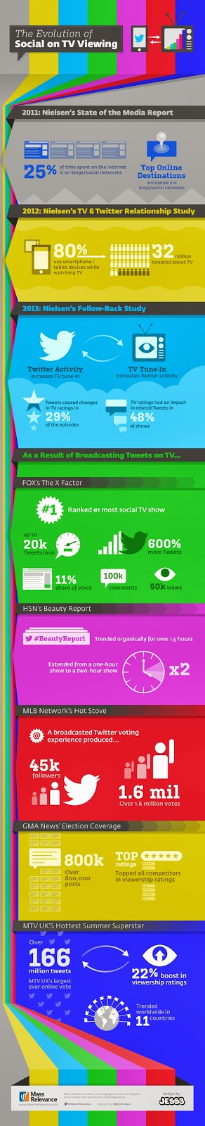Days of looking at Television and simply submitting all your focus towards that show is slowly dying as social media and networking evolves. In the article The Evolution of Social on TV viewing, Mediabistro discusses the new trend of tweeting while looking at a television show. Through their studies it’s now understood that 80% of people use their smart devices while watching TV. After reading this article I realize I definitely partake in this trend; watching television without signing in on twitter is currently not a norm for me. The moment I get ready to view a television show, I automatically log on to twitter. Not only to tweet about the television show but to also see what are my follower’s view on the content of that particular segment. Nowadays, even the actors in certain shows are present in my twitter feed adding their two cents to each episode.