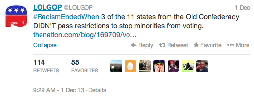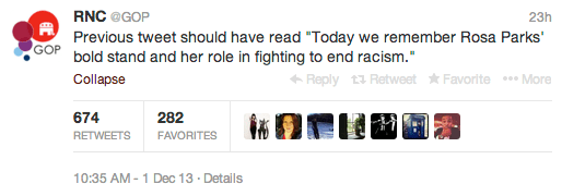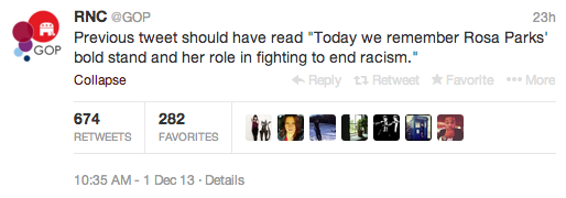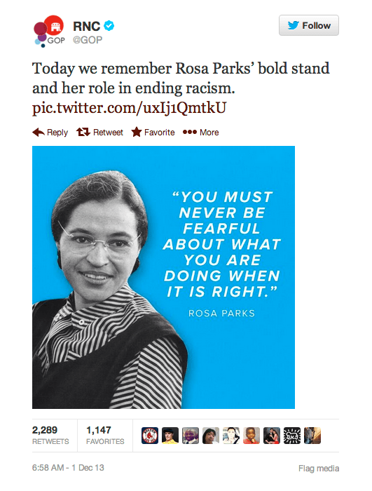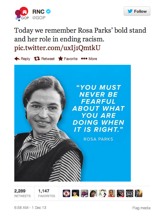 You may have heard about what stirred the most recent uproar on Twitter. On Sunday, the Republican National Committee (@GOP) sent out a tweet meant to honor the 58th anniversary of Rosa Parks’ refusal to move to the back of the bus. What should have been a lovely tribute to the civil rights activist, turned into a catalyst for an online riot.