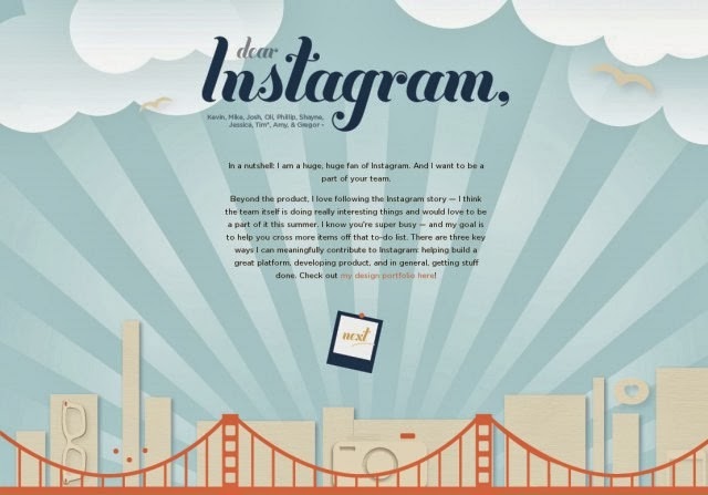 Twenty-year-old Alice Lee used her design skills to create an interactive website, complete with an Instagram stream with the social network’s API. Instagram didn’t end up hiring Lee, but she did get to speak to CEO Kevin Systrom, and Lee’s site eventually led to an internship with another company.