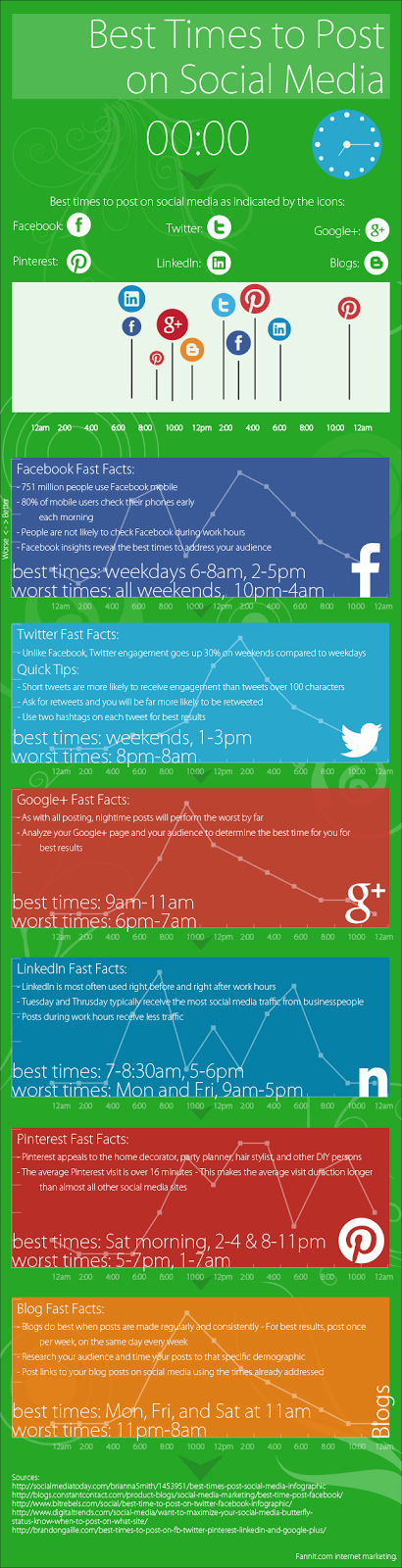 When is the right time to post on social media? A question that is constantly asked by most social media users. At my internship, I’m in charge of everything social media and I’m always hesitant as to when exactly should i post information on the different social media channels. As i continue to partake in social media, I realize more and more how important it is for organizations to be aware of the peak times on social media. So for those of you who are currently doing social media management for a company or even for your personal brand, the infographic below goes in-depth on when are the good and bad times to post on different social media channels.