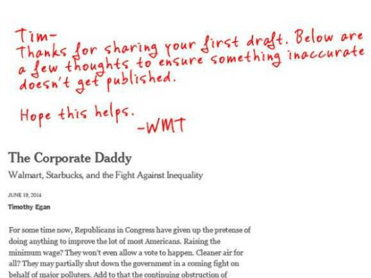 Vice President of Communications for Walmart, David Tovar, responded to the writer by providing his edits and fact checks to the article, which he submitted in red ink. His edits included links to articles which discredited Egan’s statements and backed the multi-billion dollar brand. The full article, with Tovar’s edits can be viewed on the Walmart blog.