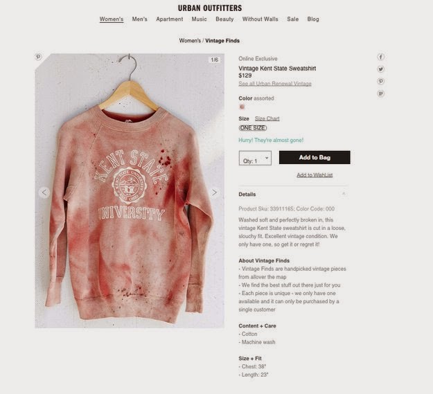 On Monday, September 15, online shoppers of UrbanOutfitters.com were shocked to see the store offering customers the chance to buy a “vintage” Kent State University sweatshirt splattered in red coloring, which looked like blood. This sweatshirt is a clear reference to the 1970 campus shootings at Kent State and the school soon released a statement saying they took “great offense” to the promotion and sale of this sweatshirt. Kent State University wasn’t the only outraged audience though.