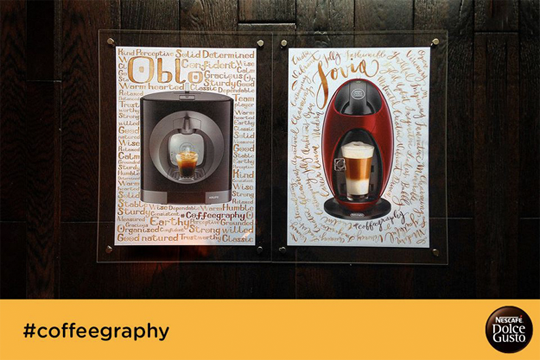 To launch two new coffee machines, Oblo and Jovia, Nescafe Dolce Gusto developed an interactive and engaging campaign to help consumer’s find themselves in the product, literally. The social media campaign ran on the brand’ Facebook page for a week, and asked fans of the page to participate by describing themselves using only three words. Those three words were then taking to match the fan to the new machine, Oblo or Jovia, which best suited their personality. Once the fan was matched, they were given the opportunity to have their name written out in coffee by a professional calligrapher. Nescafe Dolce Gusto Expresso Intenso served as ink to bring this modern coffee art to work.