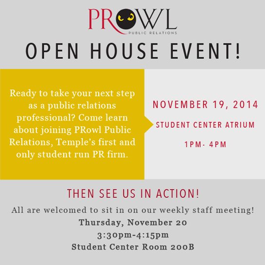 PRowl Public Relations, Temple University’s first and only student run PR firm is pleased to announce that we will be hosting our first ever Open House Event!