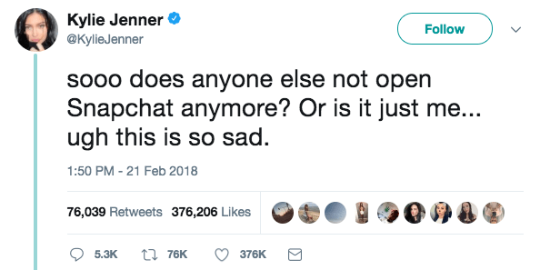 Kylie Jenner, one of those prominent celebrity Snapchatters, fed the fire surrounding the update conversation. Posting to Twitter, she asked her followers if they even open the app anymore in the wake of the update. Like-minded Snapchat veterans also began to share their disdain with the update over social media.