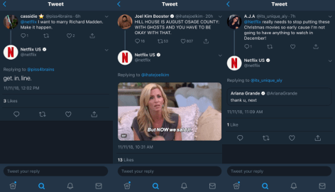Netflix is very active on Twitter with posting their own content, and also with their replies to their audience. This is something they do with incorporation of their trend following. Consumers like when they can identify with a brand, as well as when they can interact with the brand. Consumers want to be listened to, and everyone knows customer service is always important for a company. On Twitter, Netflix is very active in replying to its consumers whether it be a problem they are encountering or a reaction to a show they are watching. For example, “Bodyguard” is a new miniseries on Netflix starring Richard Madden and now Netflix’s bio on Twitter is now simply “Richard Maddens award winning jawline.” The show came out on October 24, and by changing their bio to this simple line, it generated comments from Twitter users. For example, a user tweeted out “I want to marry Richard Madden” Netflix replied “get. in. line.” By replying to a user, they bring exposure to their shows and show real genuine human interaction.