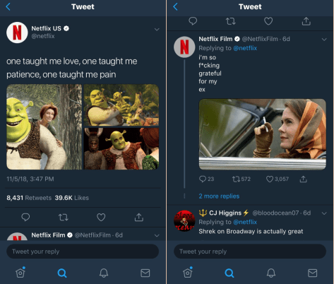 Not only did Netflix incorporate the meme to promote their newly added Shrek franchise to streaming service, but the Netflix Film affiliate Twitter left a comment also from the song, which got high interaction for a comment. Netflix uses memes and trends on social media to promote their platform all the time, and it is not just for fun. Netflix strategically places shows on their platform into the memes to generate viewership and relate with the audience.